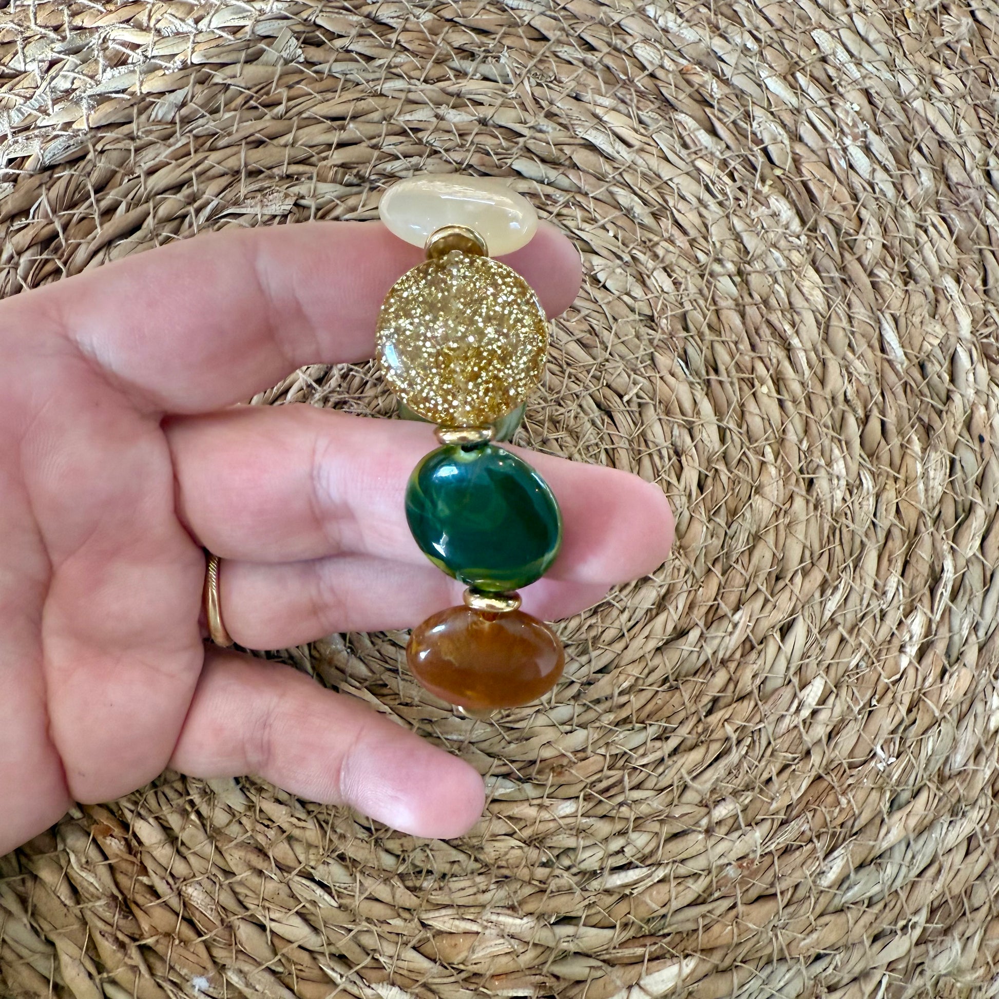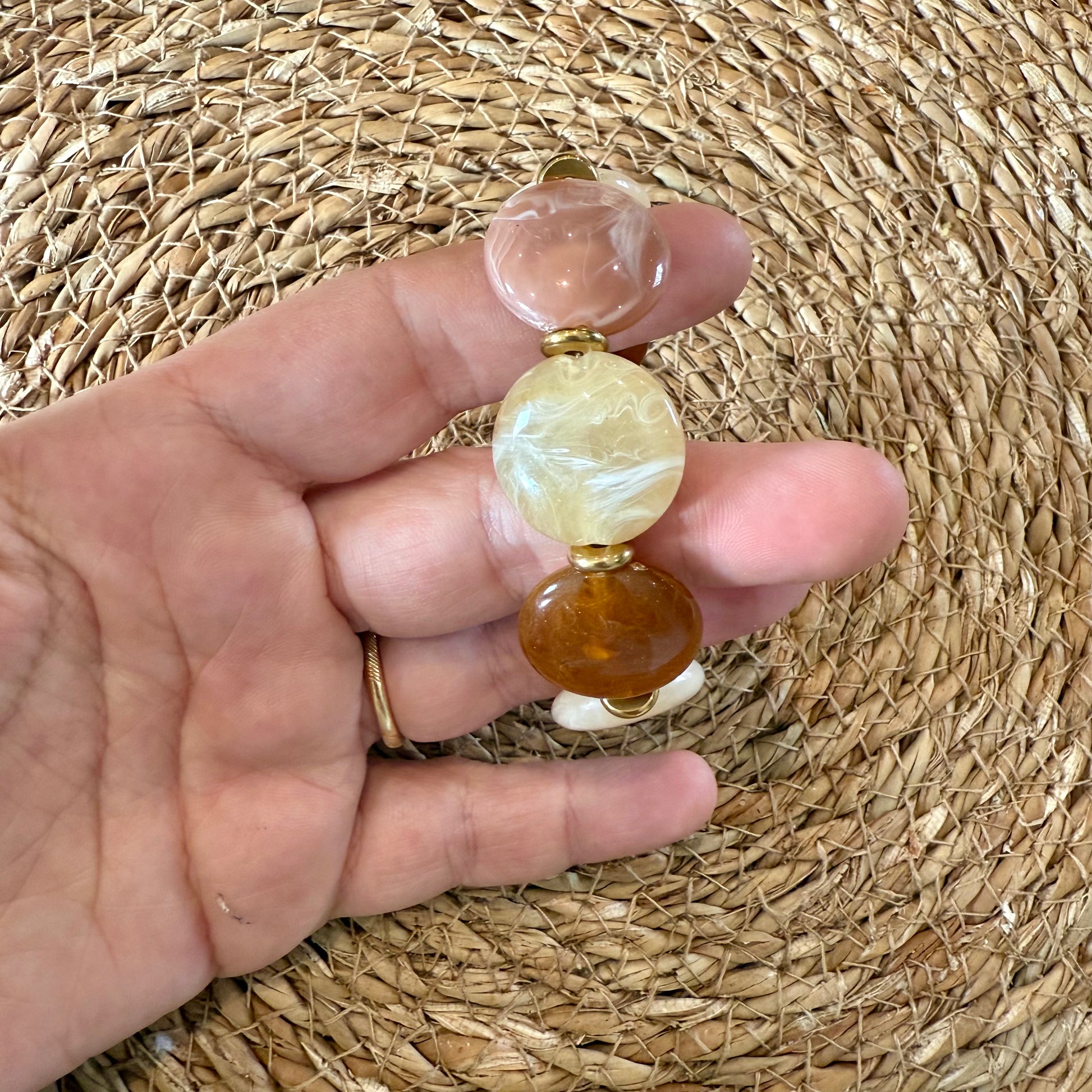 Bracelet composé de perles en acrylique montées sur fils élastique.